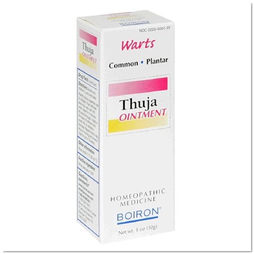 Homeopathic Medicine. Warts - Common; Plantar. Thuja Ointment contains a homeopathic medicine traditionally used to treat warts. Regulated as drugs by the FDA, homeopathic medicines are safe and reliable. Thuja Ointment is made by Boiron, world leader in homeopathy. Made in France.